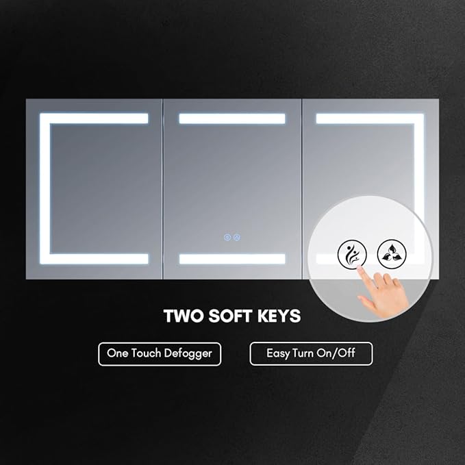 - Long-Lasting & Premium Build: Built for durability, this medicine cabinet mirror features LED lights with a 50,000-hour lifespan for years of reliable use. The doors with soft-close hinges and concealed finger-pull minimize noise and prevent slamming. With a 100,000 switch touch lifespan, the bathroom wall cabinet ensures long-term functionality and ease of use.