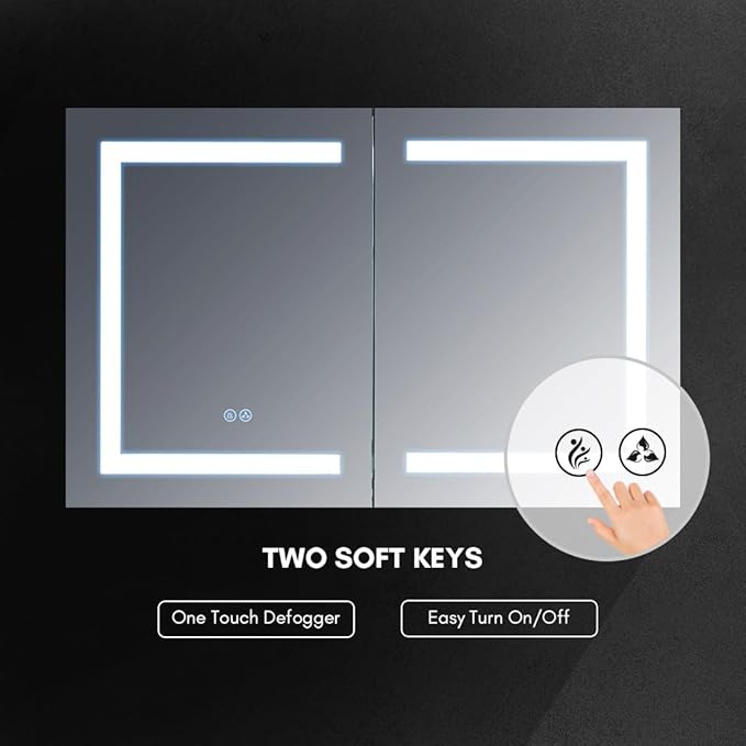 - Long-Lasting & Premium Build: Built for durability, this medicine cabinet mirror features LED lights with a 50,000-hour lifespan for years of reliable use. The doors with soft-close hinges and concealed finger-pull minimize noise and prevent slamming. With a 100,000 switch touch lifespan, the bathroom wall cabinet ensures long-term functionality and ease of use.