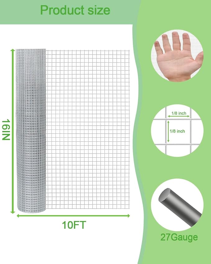 Hardware Cloth 16in x 10ft 1/8 Inch 27 Gauge, Hot-Dipped Galvanized Welded Wire Mesh, Low Carbon Steel, Animal Cage Wire Netting, Garden Wire Mesh