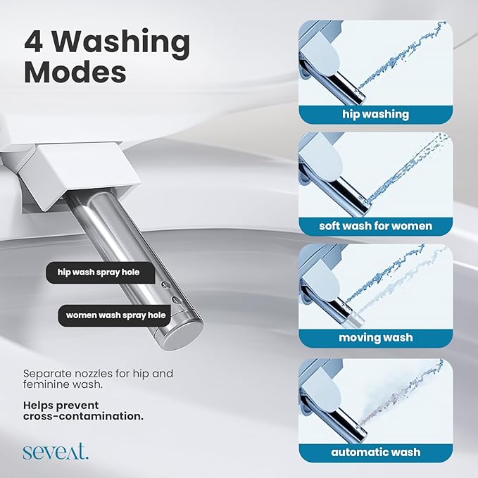 - Advanced Instant Heating & Intelligent Wash – Enjoy unlimited warm water the moment you sit down. Seveat’s smart bidet seat lets you adjust water temperature, pressure, and nozzle position for a fully personalized cleanse that keeps you fresh and comfortable every time.