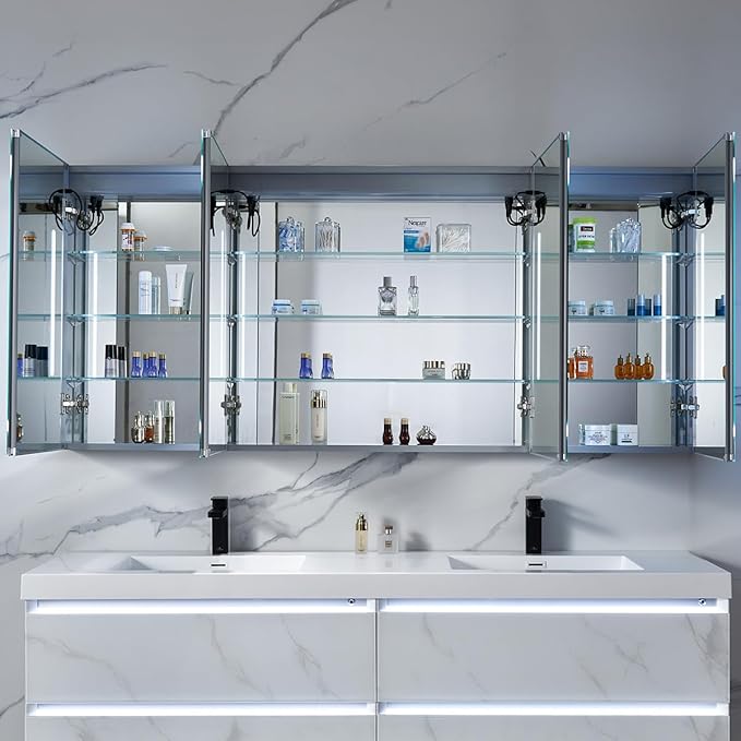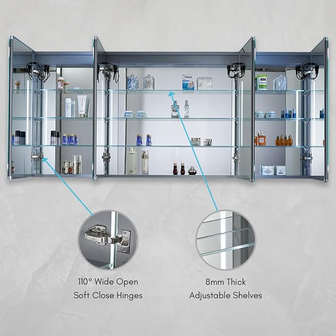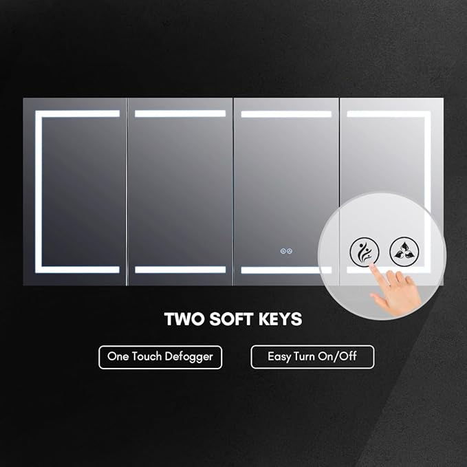 - Long-Lasting & Premium Build: Built for durability, this medicine cabinet mirror features LED lights with a 50,000-hour lifespan for years of reliable use. The doors with soft-close hinges and concealed finger-pull minimizes noise and prevents slamming. With a 100,000 switch touch lifespan, the bathroom wall cabinet ensures long-term functionality and ease of use.