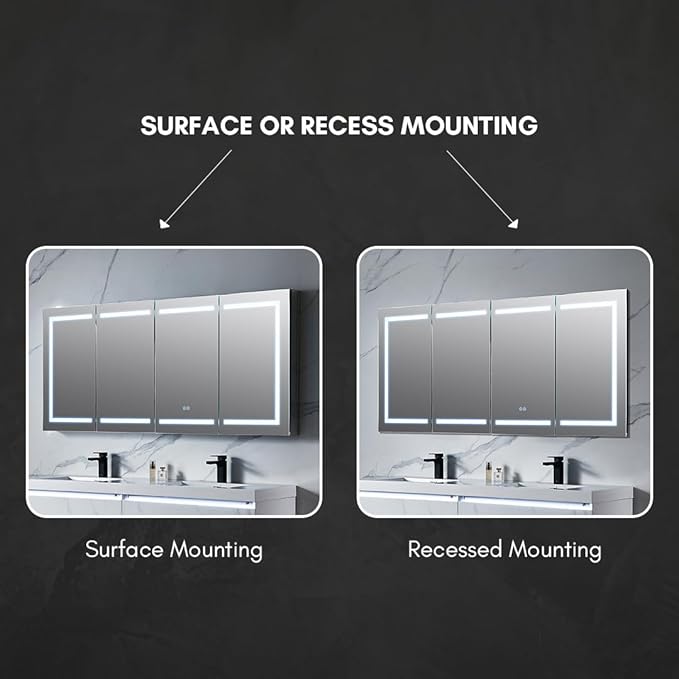 - Durable & Safe Construction: Designed for durability, the LED medicine cabinet organizer features a corrosion-resistant anodized aluminum frame with a scratch-free finish. The copper-free silver door mirror offers high-quality reflection, while the tempered glass and grooved edges provide safety and easy handling. It can be mounted either on the surface or recessed for flexible installation.