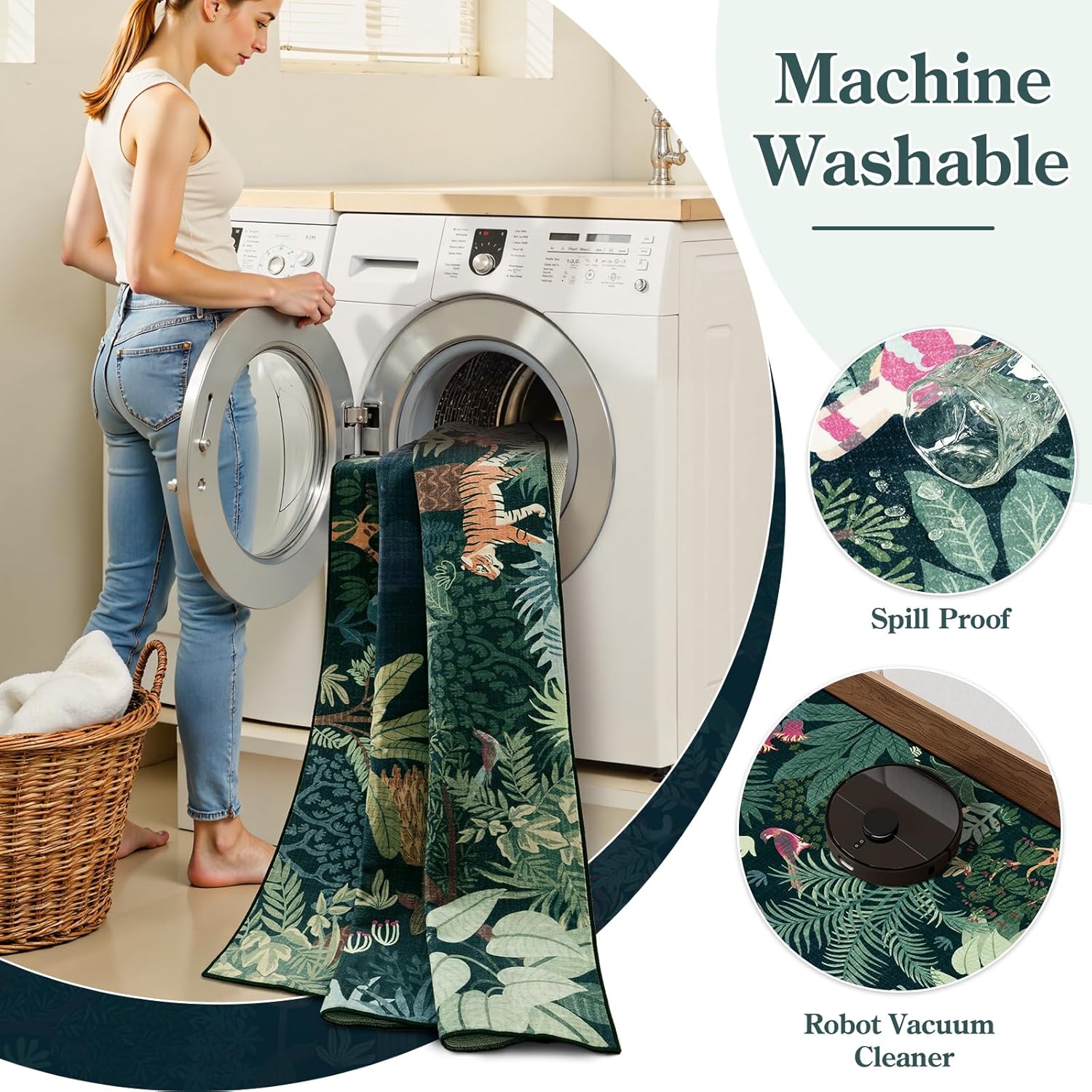 LIVEBOX Washable Bedroom Rug 8x10 Under Bed, Modern Stain Resistant Dark Green Botanical Rug for Living Room Playroom Kids Boy Room, Non-Slip Jungle Forest Print Rugs for Nursery Baby