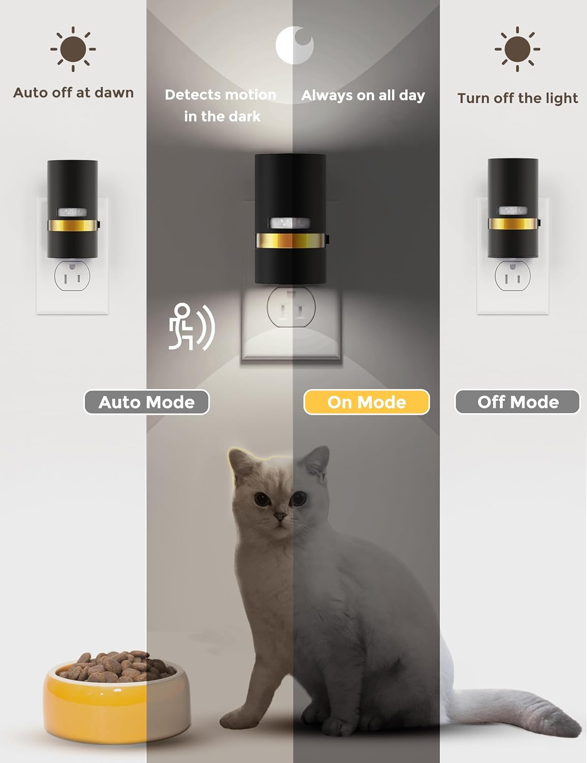 - [Motion Sensor Lights indoor] - Enjoy the convenience and energy savings of our Motion Sensor Plug-in Night Light. "On" mode - always on; "Off" mode - turns off the light; "Auto" mode - It lights up in the dark when motion is detected, automatically turning off after 60 seconds of no movement