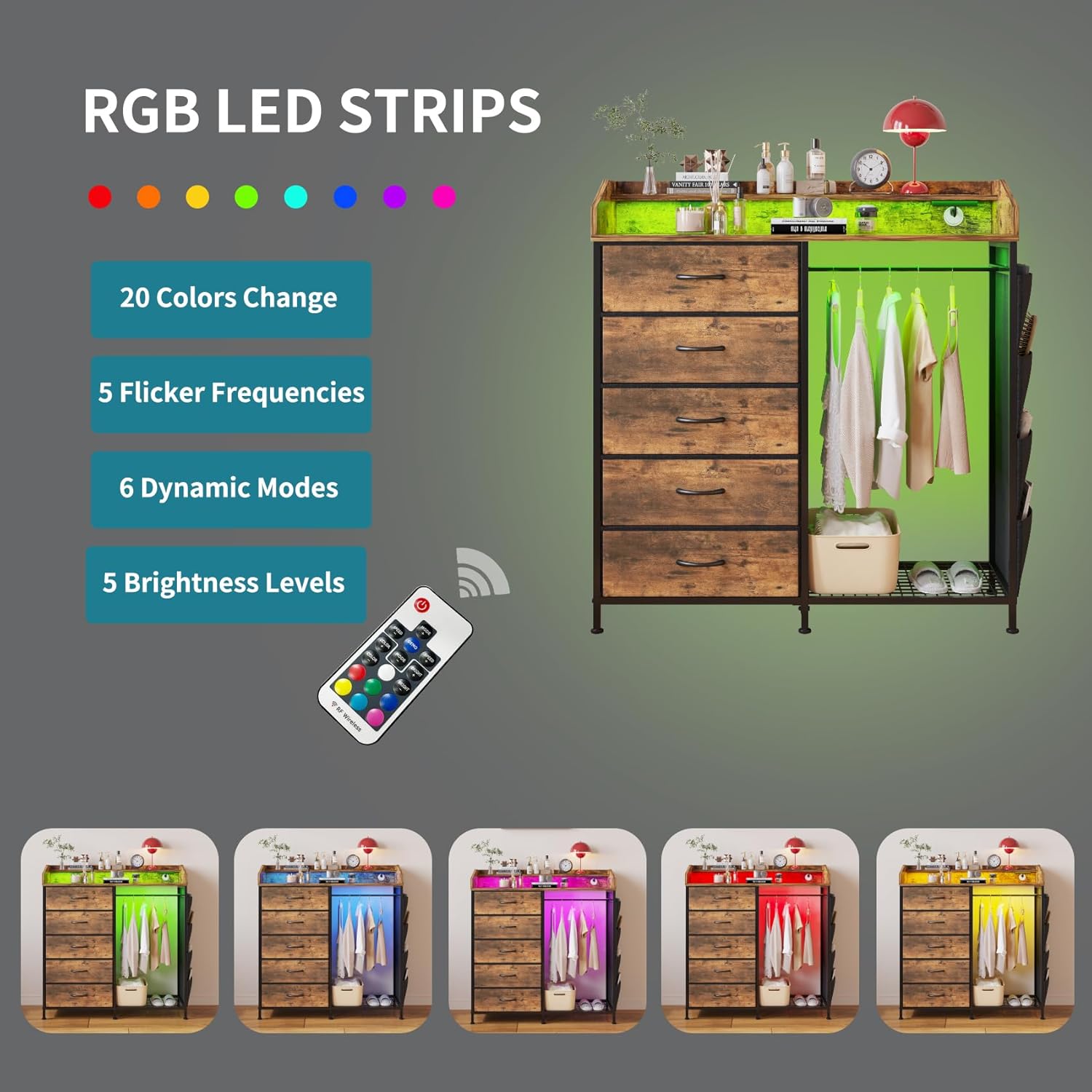 LUMTOK 2-in-1 Dresser with Hanging Racks,5 Fabric Drawers Dressers with LED Lights, Charging Station for Bedroom Living Room, Entryway, Closets (Rustic Brown)