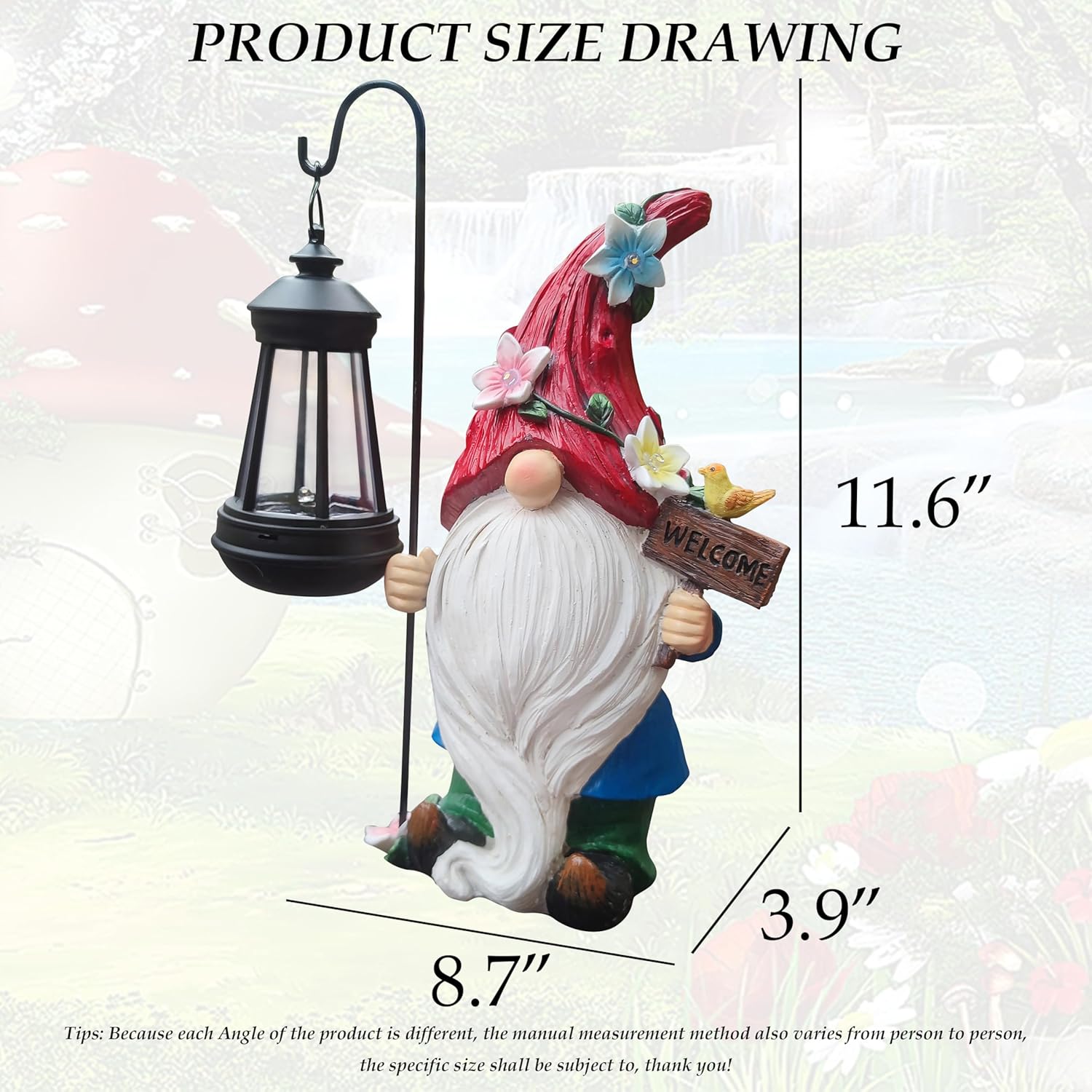 - 【Product Design】Our gnome solar outdoor statue is very cute, a gnome surrounded by flowers holding a lamp, and then holding a welcome sign, and a bird on the sign, a vibrant bird will make your garden more vivid, but also add a different color to your garden, the size of this gnome statue is 8.7X3.9X11.6 inches,This gnome figurines made of resin material,hand-painted and finished with a UV resistant coating can withstand rain,snow or scorching sun without fading .