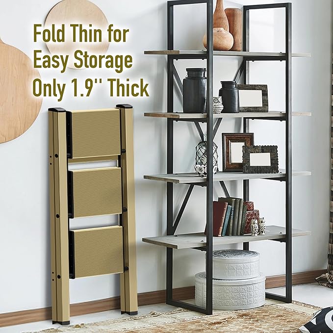 3 Step Ladder,Aluminum Folding Step Stool for Adults,Step Ladder with Wide Anti-Slip Pedal,330 lbs Capacity for Home,Office,Kitchen,Library(Gold)