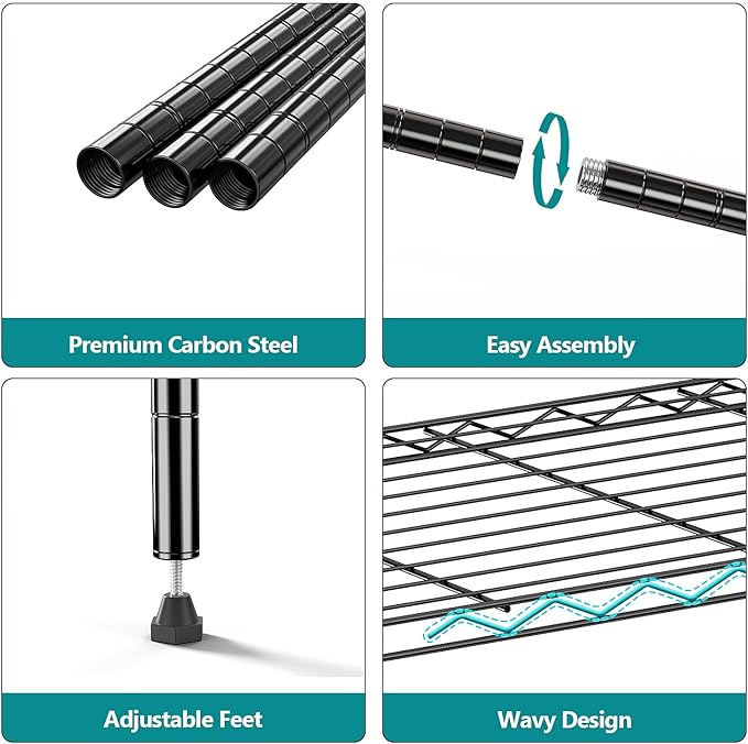 - Durable Coated Frame: Constructed with carbon steel and finished in matte black powder coating for enhanced rust resistance; supports up to 1250 lbs per unit; suitable for storing kitchen tools, bins, or laundry items