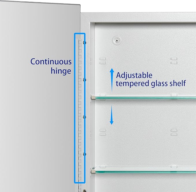 - 【Hinge】The bathroom medicine cabinet is with continuous piano hinges, providing strong support for the door panels; and also make it easier to control the angle at which the doors open and close.