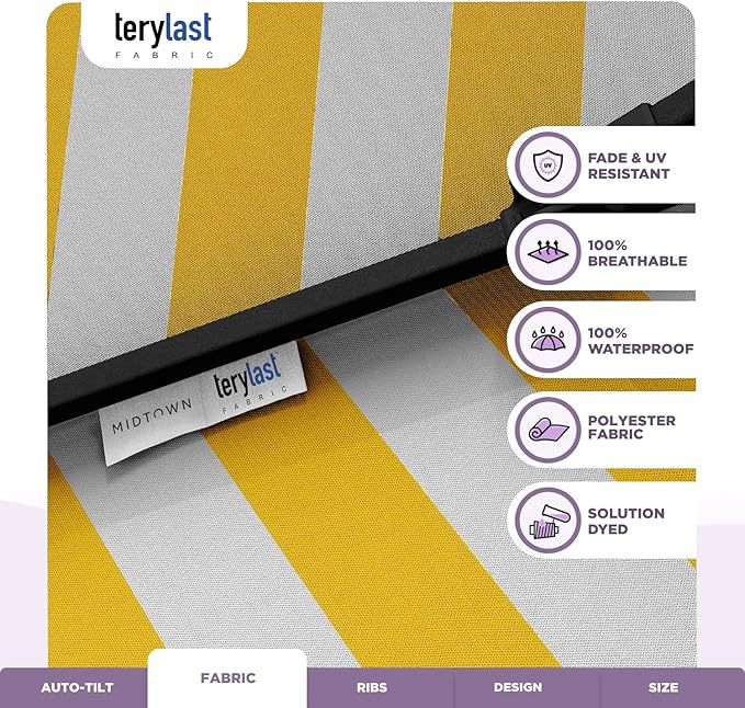 Midtown Umbrellas 10-Year-No-Fade - 10 Feet outdoor umbrella Terylast White/Yellow Stripes Polyester Fabric - Auto-Tilt Aluminum Frame Patio Umbrella For Deck, Garden, Pool - Black Pole