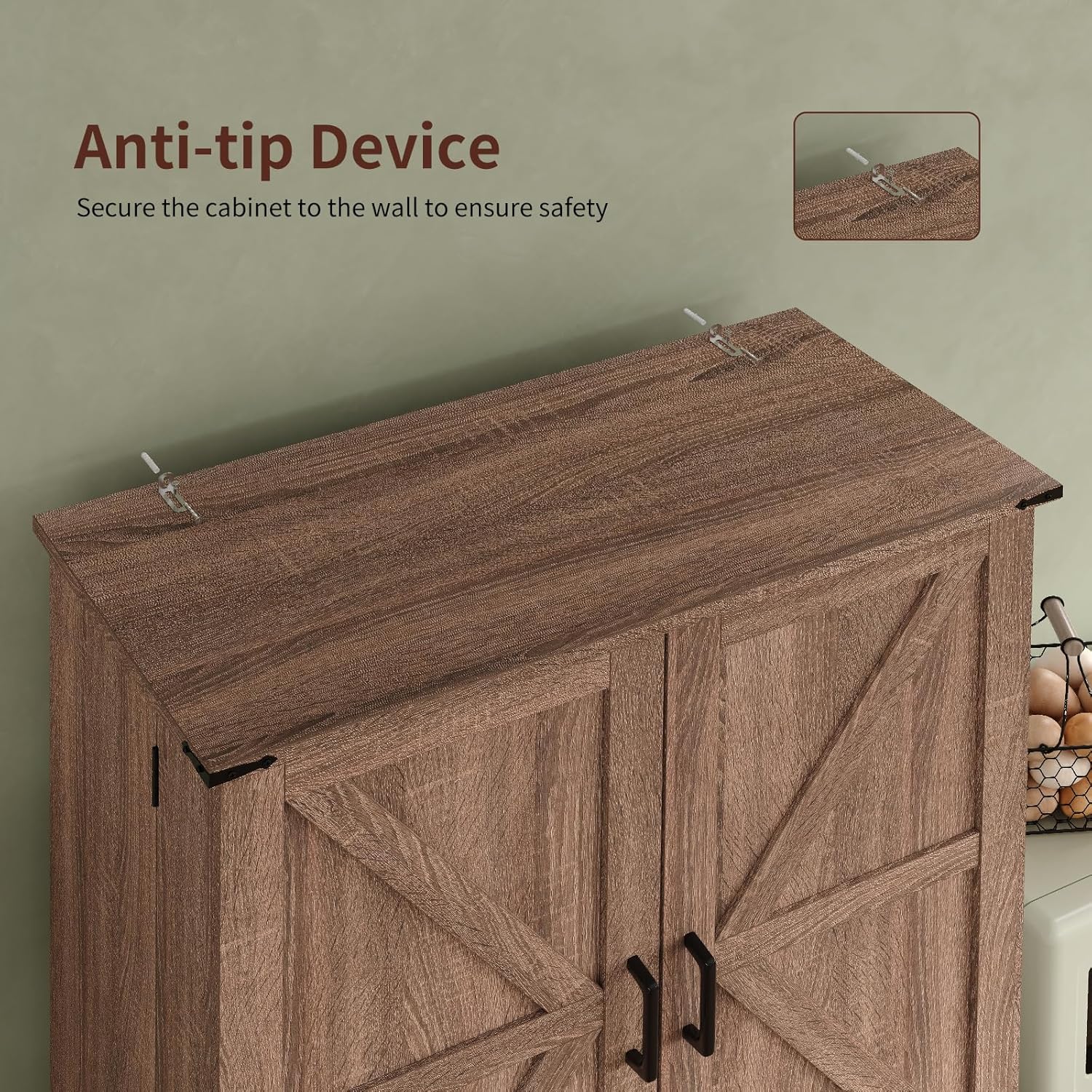 - Retro and Elegant Design: Kitchen pantry cabinet has espresso as the overall color tone. The design of the cabinet door draws on the old barn door and adds a wide black metal handle, which blends with the metal decoration on the top, exuding a retro yet stylish unique temperament, no matter where you place it, it will become the focus of attention