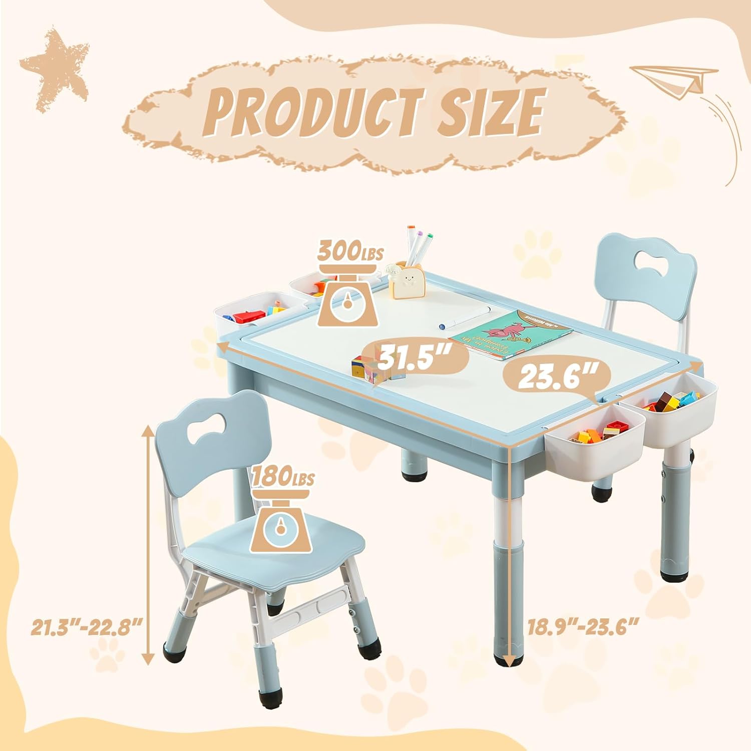 Multi Functional Kids Table and 2 Chairs Set, Graffiti & Building Blocks Double-Sided Tabletop, Toddler Play Table with Drawers, Large Storage Space, Gift for Boys/Girls, Blue