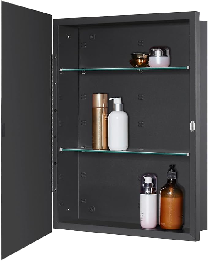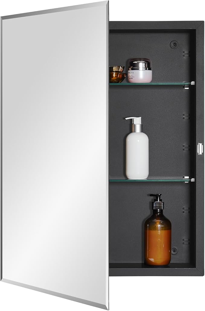 Black Bathroom Medicine Cabinet with Beveled Edge Mirrored Door 20 x 26 inch, Recessed or Surface Mount, with Adjustable Glass Shelves