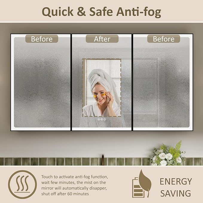 - 【Anti-fog Function】Activate the anti-fog button, mirror center panel will takes 10-15 minutes to achieve defogging, the moisture proof stripe will eliminate the fog automatically. You don’t need to wipe steam or splashes after shower. It turns off after 1 hour automatically,which is safe and energy efficient