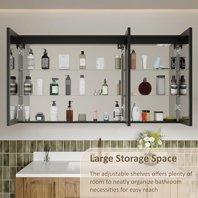 - 【Ample Storage Space】The LED mirror cabinets boast a generous capacity, it has 2 adjustable glass shelves, provide more space for your daily storage without taking up countertop space. The hidden design keeps dust out, ensuring efficient organization, and easily accommodate personal and bathroom items such toothbrush, razor, hairdryers and cosmetics