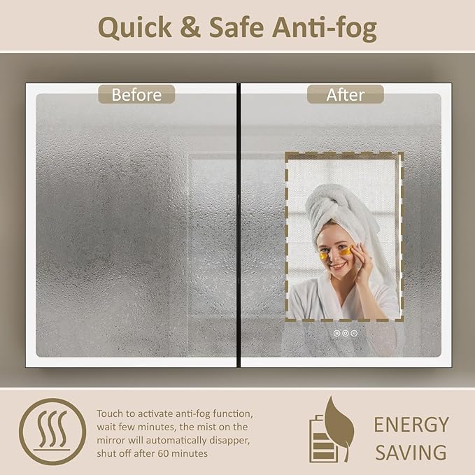 - 【Anti-fog Function】Activate the anti-fog button, mirror center panel will takes 10-15 minutes to achieve defogging, the moisture proof stripe will eliminate the fog automatically. You don’t need to wipe steam or splashes after shower. It turns off after 1 hour automatically,which is safe and energy efficient