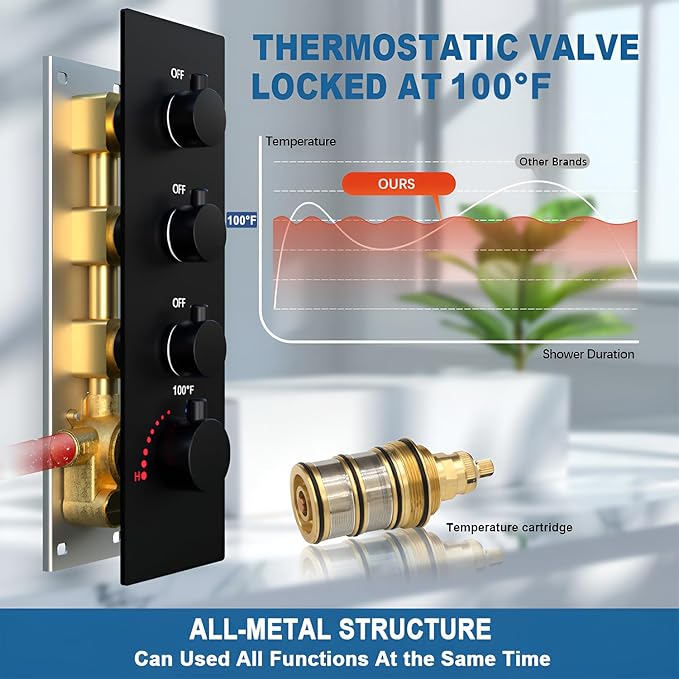 - 【Thermostatic Dual Shower System】Dual shower head system equipped brass thermostatic cartridge. The safety button that quickly keeps the water temperature at a constant 38°C/100.4℉. It is easy to use without the need for each adjustment. It can save you from scalding caused by sudden change of hot or cold water pressure