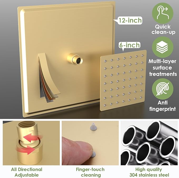 - 【Dual Rain Shower Head】Dual rain shower system with enlarged 12-inch ceiling rainfall shower head and a powerful 6-inch wall mounted shower head, both of them can be used together. While the 360° adjustability allows you to find the perfect angle for ultimate relaxation and comfort. A must-have full body shower system for every home seeking a luxurious spa bath