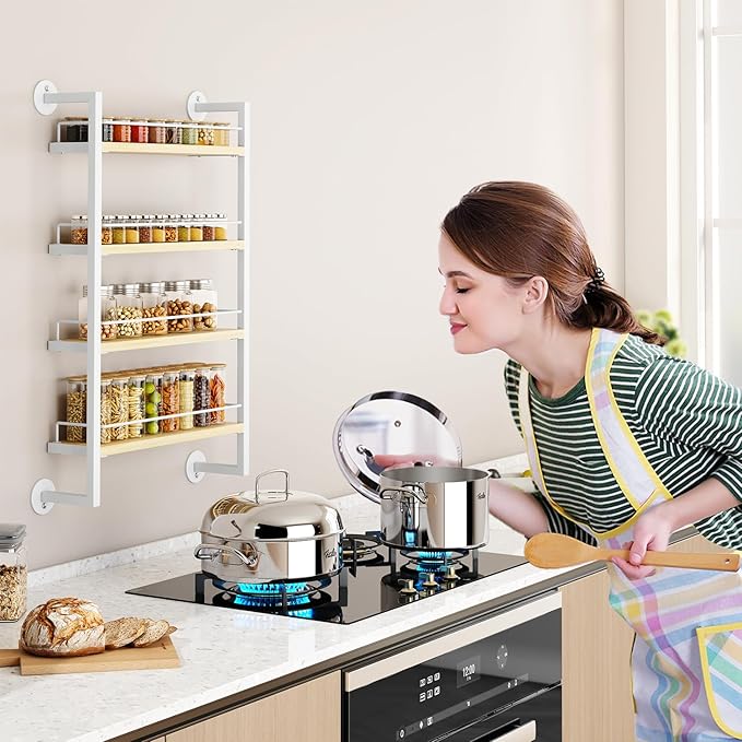 - WOODEN SPICE ORGANIZER: IBUYKE spice rack is made of 4 layers of chipboard and metal frame, with strong and stable structure and stylish appearance. The vintage look suits any room decor style and makes your kitchen or pantry look fabulous.Compared with most products on the market, our spice rack is more sturdy and durable with large capacity to meet your different needs.