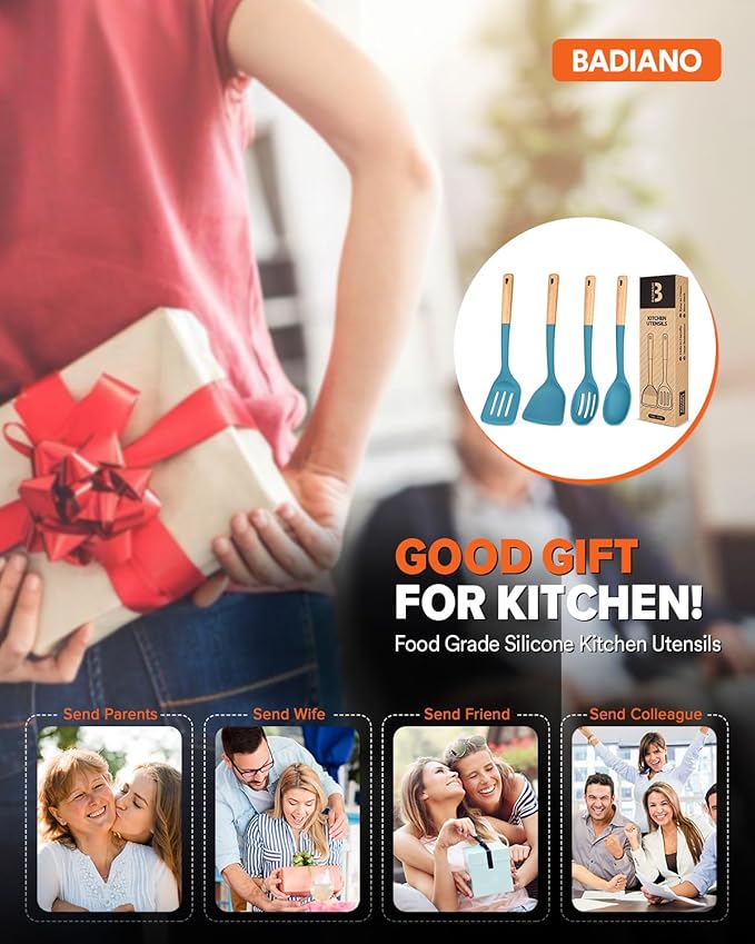 Silicone Cooking Utensils Set, Perfectly Angled for Frying, Mixing,Serving,Draining,Turning and Stirring, BPA-Free Matte Silicone, Wood Handles, Safe for Nonstick Cooking Surfaces,4 Pack (Blue)