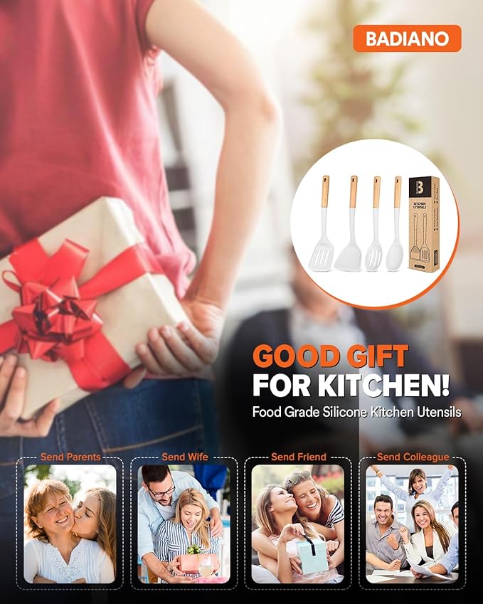 Silicone Cooking Utensils Set, Perfectly Angled for Frying, Mixing,Serving,Draining,Turning and Stirring, BPA-Free Matte Silicone, Wood Handles, Safe for Nonstick Cooking Surfaces,4 Pack (White)