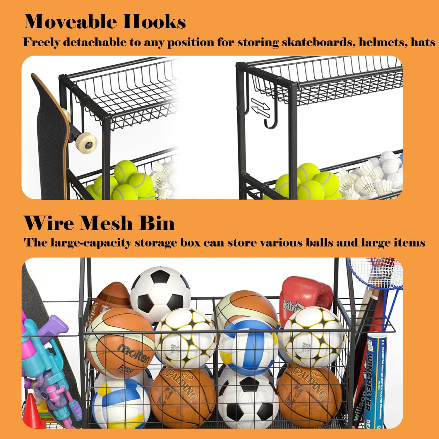 - Large Capacity Storage: The ball storage rack have two large storage boxes can store various ball toys, sports equipment and other large items. Four encrypted and deepened movable net baskets can hold baseballs, helmets, small dumbbells for women and other items. The side racks on both sides can hold rackets, yoga mats, ball barrels and other items that need to be placed vertically. The multiple hooks can store skipping ropes, gloves and other protective items neatly to save space.