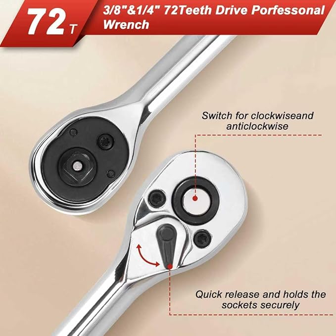 - 【Organized Storage】: This ratchet wrench socket set comes with a Wear-resistant tool box, all sockets are neatly fixed in the box for easy carrying, transportation, safe storage, and quick organization that make you take 1/4 and 3/8 drive socket set anywhere to meet your job requirements, working efficiency.