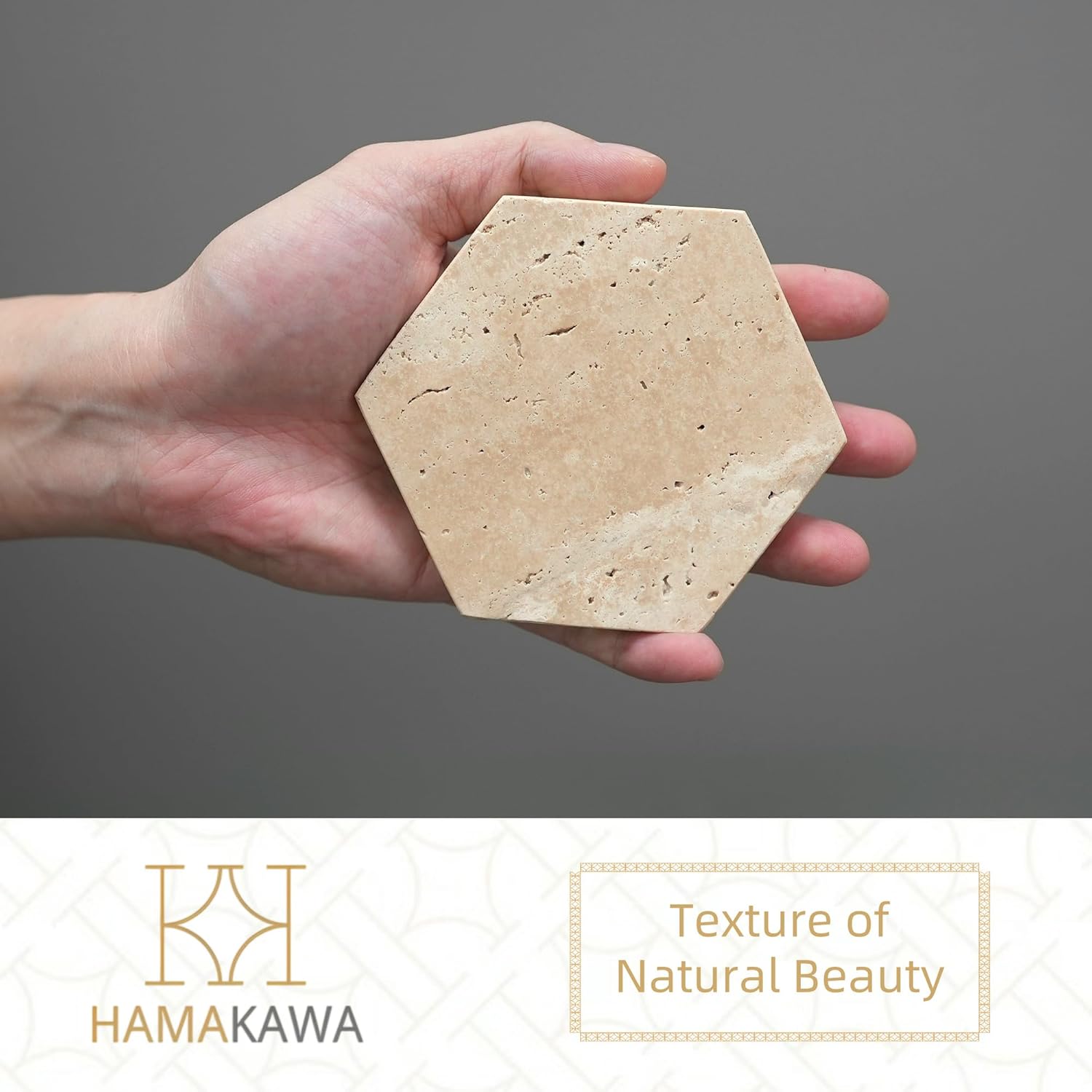 Real Natural Marble Coasters Set of 4, Vintage Stone Coasters 4 Inch, Hexagon Travertine Drink Coaster for Coffee Table, Living Room, Office Decor