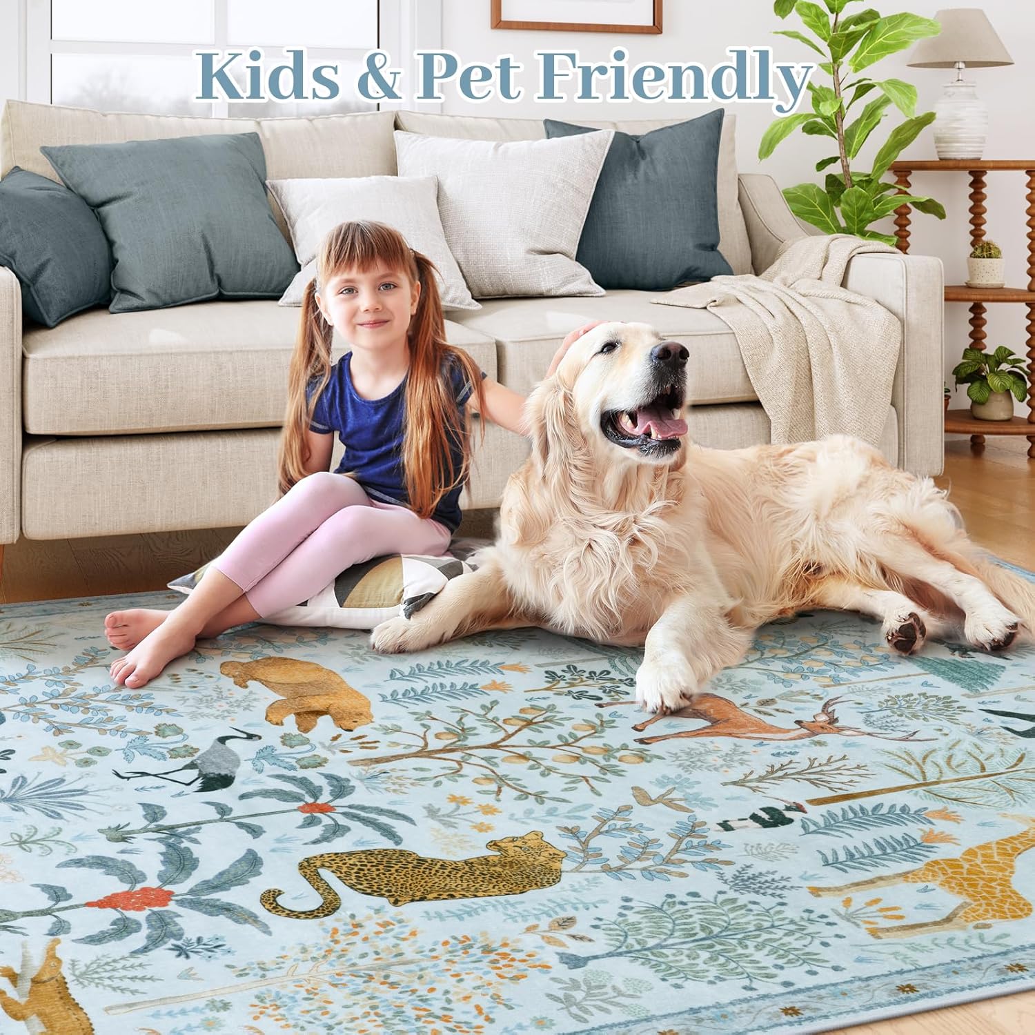 OJIA Animal Print Washable Area Rug 5x7, Soft Nursery Rugs for Living Room Ultra-Thin Non-Shedding Kids Bedroom Rug, Stain Resistant Throw Rug Large Carpet for Dining Room, Light Blue