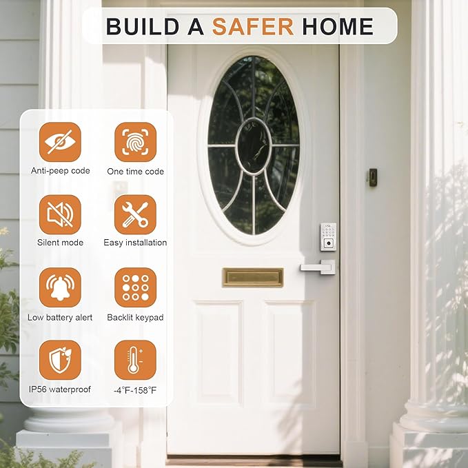 - [Fingerprint Unlock] It uses biometric technology, with a recognition rate of up to 99.8%, can accurately identify your fingerprint and unlock the door in just 0.3s, securely accommodating up to 50 fingerprints, ensuring seamless access for multiple authorized individuals.