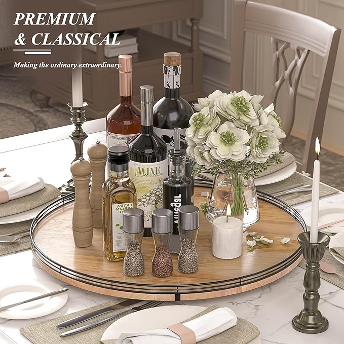 - UPDATED DESIGN: With larger wood base on this lazy Susan for table top, the turntable organizer doesn't wobble, even with heavier items on it. With premium oak wood and classical iron fence make this lazy Susan turntable stylish, functional and adding a touch of rustic charm. it’s also very easy to clean. There are included anti-slip pads on the bottom of the lazy Susan for extra surface protection.