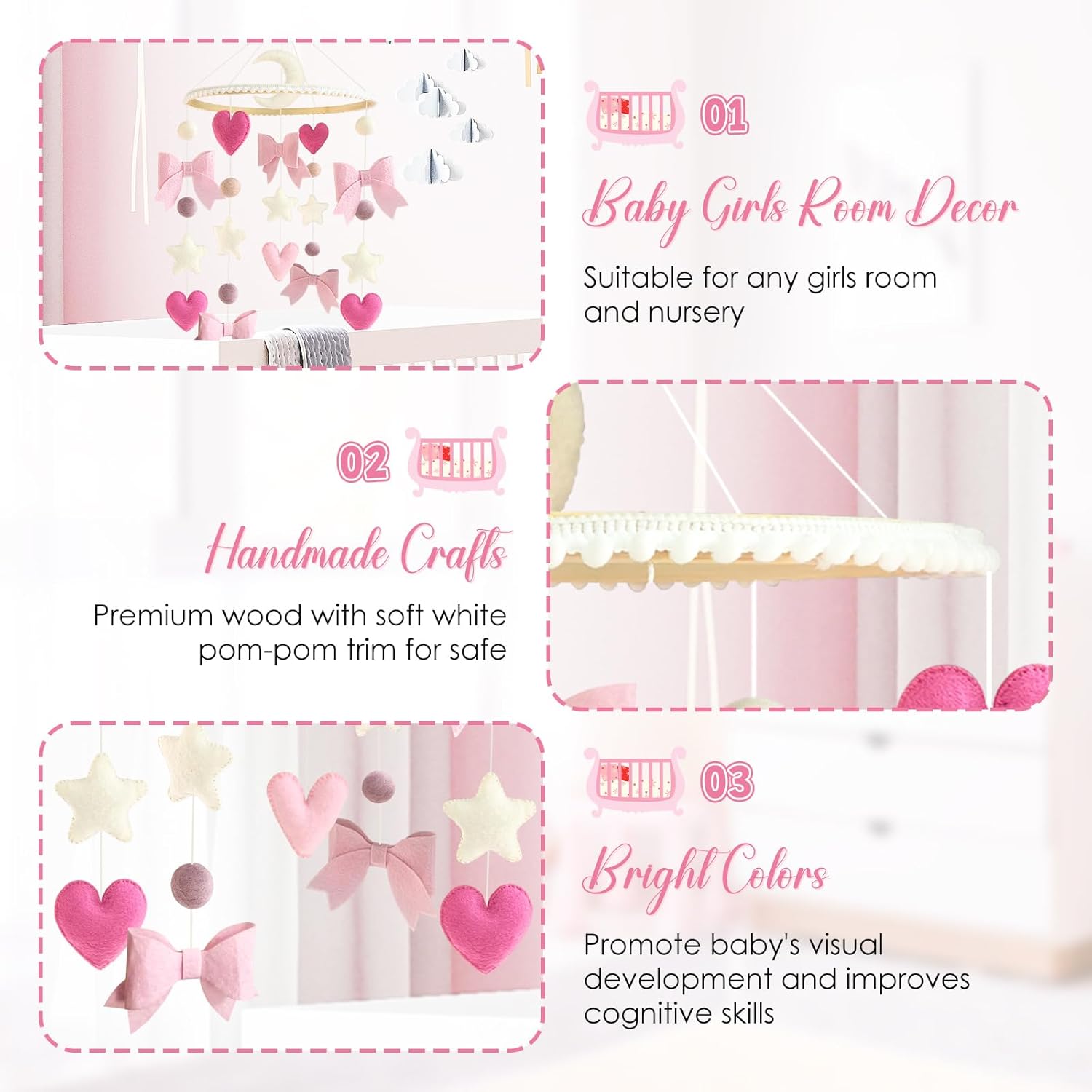 - Pink Bow Decor for Girls Room: Our pink baby mobile for bassinet is made up of pink bows, moons, stars, hearts and woolen felt balls. These cute designs will become the focus of the nursery, adding charming colors to the baby girl's crib decoration, creating a fun, warm and comfortable environment.