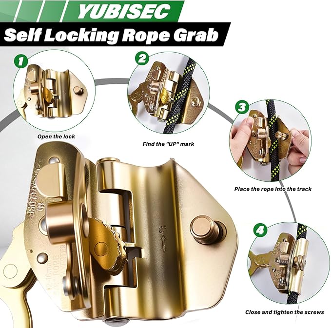 - ALLOY ROPE GRAB - The rope come with double lock-locking screw mechanism and locking clip added two safeguards to your work environment.Its min. Breaking strength: 3600 lbs, meets ANSI Z359.1.The rope grab hook is adjustable, allowing you to easily move along the life rope