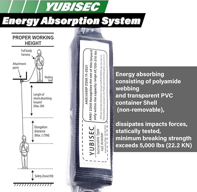 - ENERGY ABSORBER - The rope is equipped with a shock protection absorber, minimum breaking strength more than 5,000 pounds, It is designed for up to 6-foot free fall applications, maximum deployment distance of 48 inch/1.2m & average arresting force 900 lbs