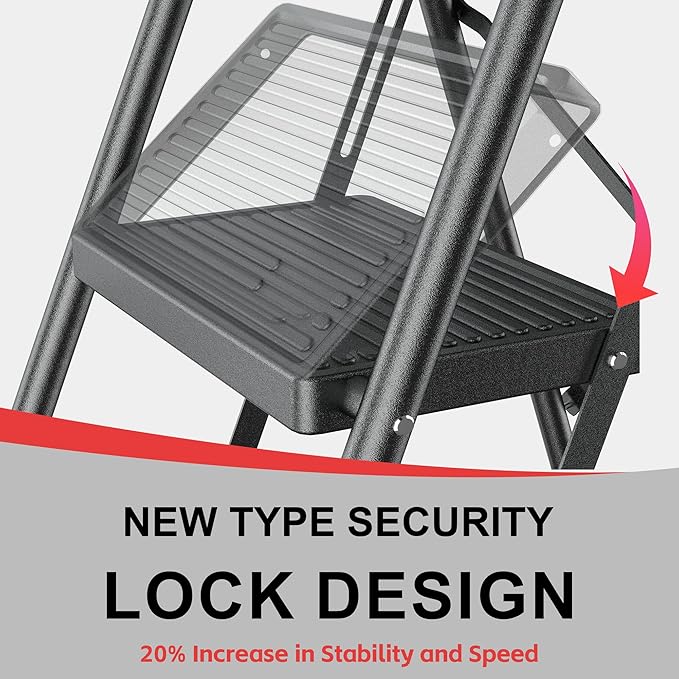 - Enhanced Safety and Stability - Featuring a high-strength steel frame and gravity lock system, our step ladders offer robust support that engages securely for your peace of mind. With Dual-Sided Reinforcing Ribs, Our ladders provide a sturdy and reliable climbing experience, ensuring stability and reliability in every use. This makes them ideal for kitchen step stools for adults and stepping stool for adults, offering a safe and secure option for reaching high places.