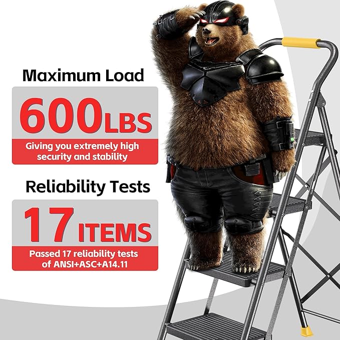 - Heavy-Duty Performance and Durability - 4 step stool ladder that's built to last, with the capacity to hold up to 600 pounds , is ideal for heavy-duty use. Crafted from thickened 9mm Alloy Steel, these ladders are resistant to wear, corrosion, rust, and temperature extremes, ensuring long-lasting performance and durability. They are perfect for ladders for home and step stools for adults, providing a reliable solution for all your height-related needs.