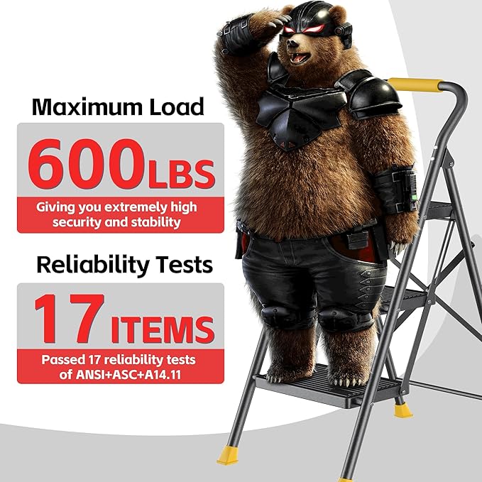 - Heavy-Duty Performance and Durability - 3 step stool ladder that's built to last, with the capacity to hold up to 600 pounds , is ideal for heavy-duty use. Crafted from thickened 9mm Alloy Steel, these ladders are resistant to wear, corrosion, rust, and temperature extremes, ensuring long-lasting performance and durability. They are perfect for ladders for home and step stools for adults, providing a reliable solution for all your height-related needs.