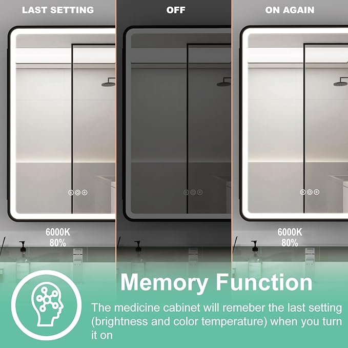 - 【Anti-fog Function】Activate the anti-fog button, mirror center panel will takes 10-15 minutes to achieve defogging, the moisture proof stripe will eliminate the fog automatically. You don’t need to wipe steam or splashes after shower. It turns off after 1 hour automatically,which is safe and energy efficient