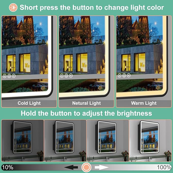 - 【3 Color & Brightness Adjustable LED Light】LED medicine cabinet mirror for bathroom has 3 color light, short press the on/off button for 3 light mode adjustments, cool light, natural light, and warm light. Long press the dimmable button for step-less adjustment of light brightness from 10%-100%