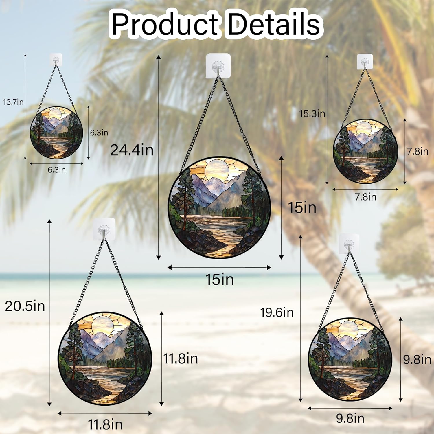 Stained Glass Window Hanging, Sunset Mountains Lake Tree Sun Catcher for Window Home Decor Landscape Suncatcher Mother's Day Birthday Gifts for Women Men Mom and Nana 7.8 in