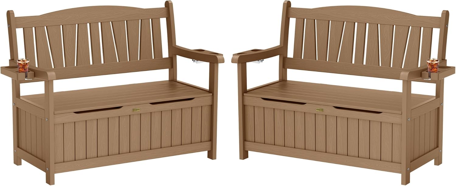 YEFU Outdoor Storage Bench for Patio: Heavy Duty Garden Bench Set of 2 with 96° High Backrest & Oversized Seating - HIPS Weatherproof Patio Bench with Storage for Porch Park Backyard, Teak