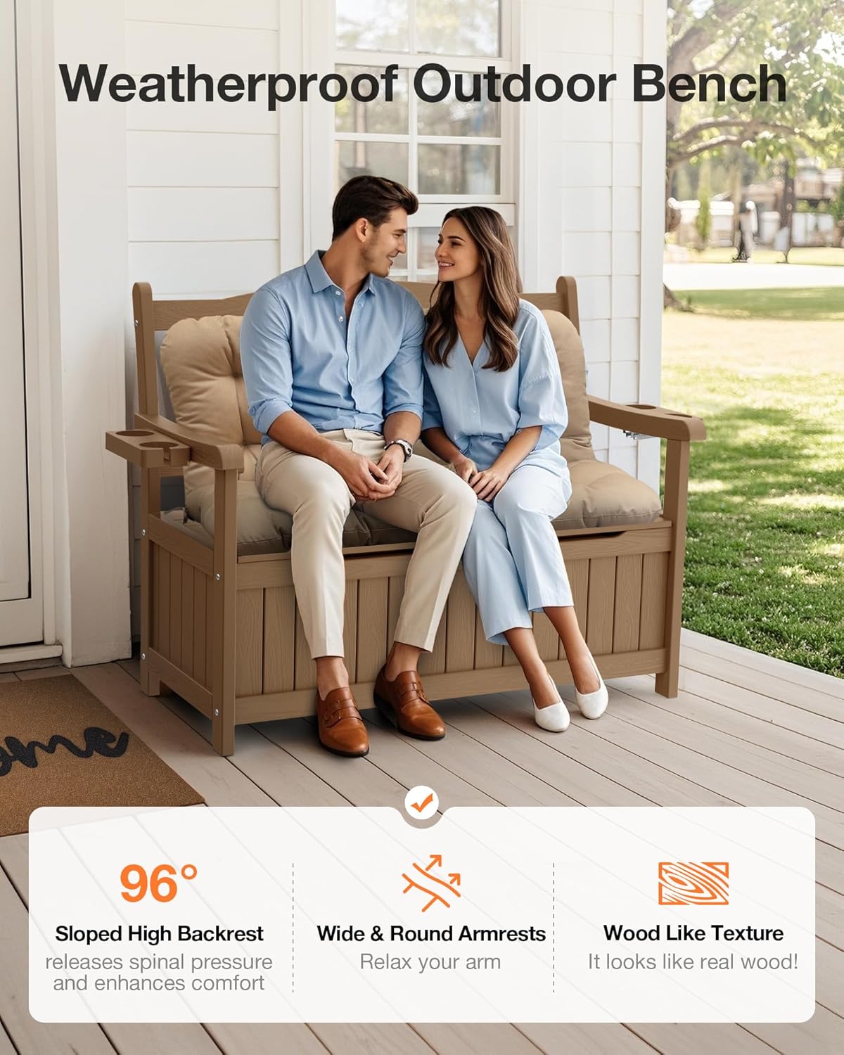- Double Cup Holders Design & Enjoy Your Leisure Time: With two integrated cup holders, this outdoor bench with storage allows you to keep your beverages or wine glasses close at hand at any time and enjoy small moments of relaxation and leisure with your friends or family. Meanwhile, press the cup holder can fold and hide it.