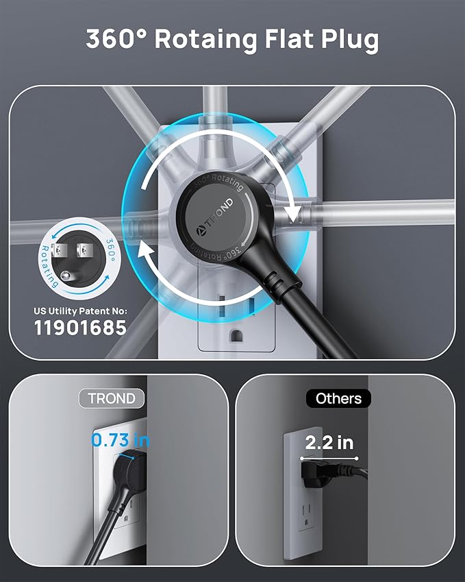 - 360° Rotating Flat Plug: 360° rotating flat plug design can fit any plug and be inserted perfectly at any angle(0.73 in thickness). Handy to use in confined areas. US Utility Patent No. 11901685. Made of 14AWG pure copper, the 5-foot extension cord is heavy-duty and has better current carrying capacity (15a).