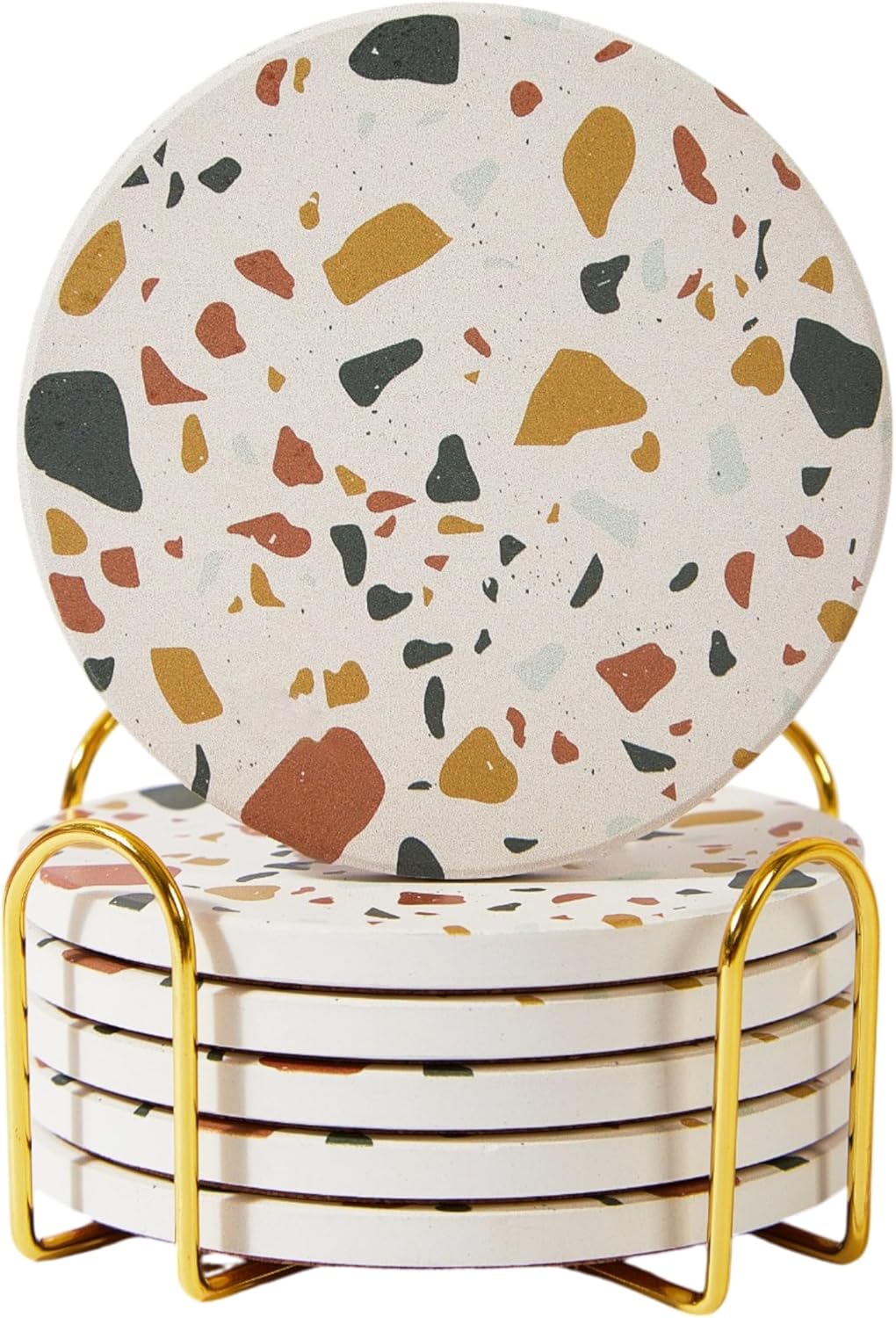 Terrazzo Drink Absorbent Coasters with Holder Set of 6, Ceramic Coaster for Drinks, Coffee Table Decor, Water Absorbing Stone Coaster for Drinks (Sunset)