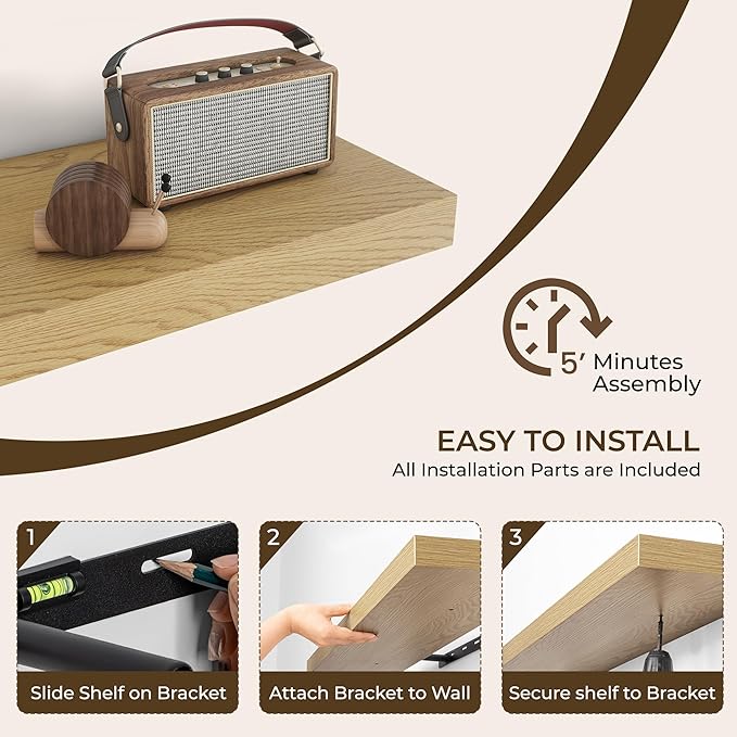 - Easy To Assemble: This floating shelves not only come with stainless-steel galvanized invisible brackets, but also equipped a fixing screw at the bottom to fix the shelf on the support rod, which solves the problem of sliding and is not easy to damage, and can be used for a long time. Instructions, magnetic level, drywall anchors, and screws included. This is great because you can easily mount these rustic shelves Gap-Free to any surface in less than 10 minutes
