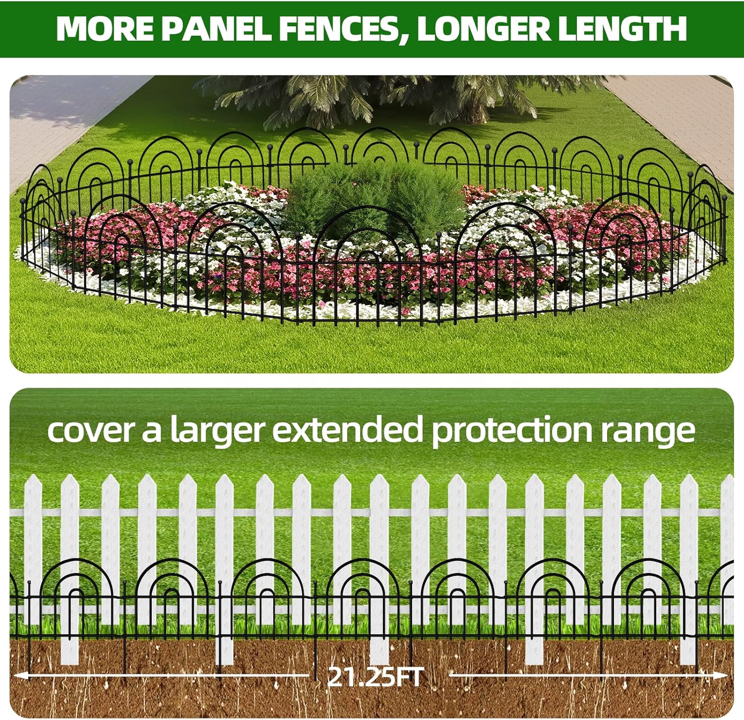 - Longer Size: Each piece of the garden fence barrier is 17" long and 13" high. The entire length of the 15 panels fence set is 21.25 feet long! Under same quantity, longer garden can be connected to make a larger fence, can be extended to different shapes according to your special uses. They can be arranged in one straight line, a curved shape, 'L', 'O' or zigzag shape, fence panels can be adjusted to uneven terrain