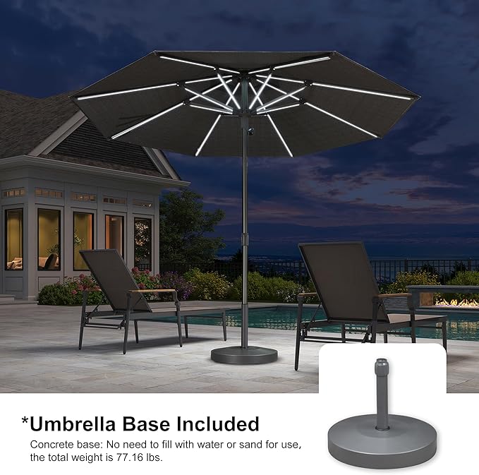 PURPLE LEAF 10 FT Semi-Auto Outdoor Patio Umbrella with Base Market Table Sun Umbrellas with Led Lights and 8 Aluminum Sturdy Ribs for Backyard Deck Garden Pool(Gray Pole Gray Canopy)