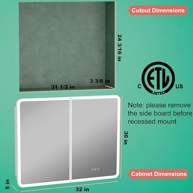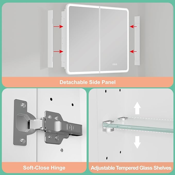 - Special Feature : Smart Touch Control, Lighting Memory Function, Dimmable, 3 Color Lighting Modes, Defogger, Space-saving, Soft-close Hinges Smart Touch Control, Lighting Memory Function, Dimmable, 3 Color Lighting Modes, Defogger, Space-saving, Soft-close Hinges