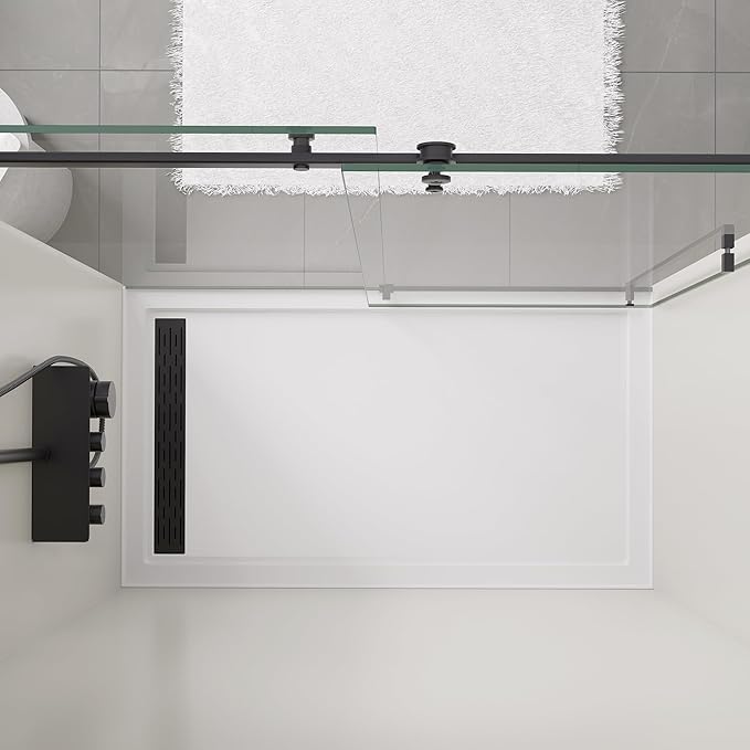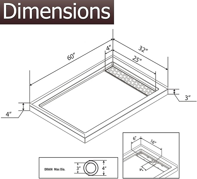 - 【Dimensions】MORVANO 60" shower base 32" W x 60" L x 3" H in white made of glossy acrylic.Right drain location with finish with reinforced acrylic and a removable black cover.(Drain included)