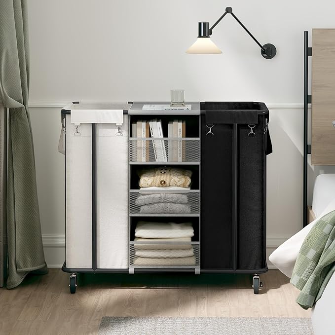 - Laundry Sorter with Hanging Bag; Double Compartment Structure: Divided laundry hamper makes it simple and easy to sort and organize clothes, with 2 sections separate the darks from lights. Exclusive design adds a hanging bag to the traditional dirty clothes basket, it can easily store your laundry necessities and provide storage space for laundry detergent, fabric softener and other bath products. If you use it in your bedroom or living room, you can also use it to store some small items of clothing or socks, etc